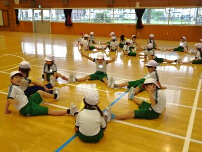 【6年生】新体力テストを実施する際、6年生は自分たちだけでなく、2年生のお手伝いも行います。どんなふうに導いたら良いか、運動を実践しながら確かめ合いました。