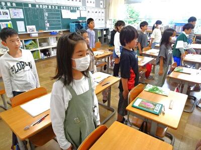 【4・5・6・7組】1枚目と2枚目の写真は、朝の会の様子です。一人一人が交代で司会を務めますが、とてもしっかりできていて素晴らしいです。