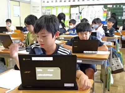 【5年生】1枚目の写真は、理科の「雲と天気の変化」の学習の様子です。昨日、屋上に行って空や雲の写真を撮影してきました。今日は、その写真を使いながらまとめています。