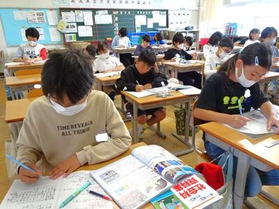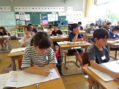 【4・5・6・7組】1枚目の写真は、国語の言葉に関するテストに挑戦している様子です。真剣です。
