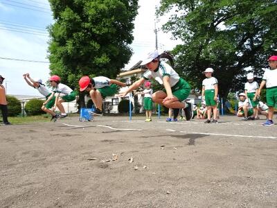 【1年生】1枚目の写真は、体育の「走の運動遊び」の活動の様子です。いろいろな走り方の練習をしました。写真は、折り返しリレーのスタートの様子です。