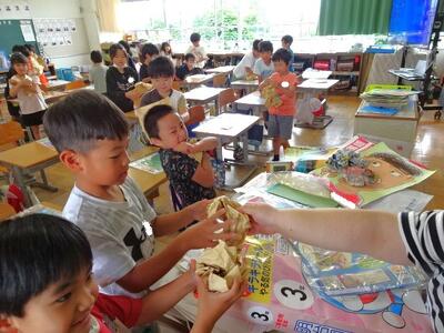 【2年生】1枚目の写真は、図画工作の「ふしぎなたまご」の活動の様子です。前回作ったたまごから、今日はひながかえります。たまごをジグザグに切って生まれてきたのは何でしょう。