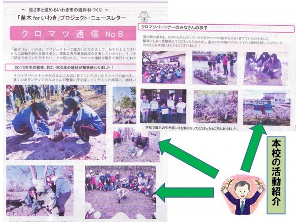 さて、過日学校緑化コンクールの現地審査が終了しましたが、本校が取り組んでいる福島県いわき市の海岸林再生事業に(クロマツの苗木植林活動)ついて6月に続き、主催者から感謝状が届きました。また、機関誌に本校の活動も紹介されていますのでお知らせします。再生途中ですが、今後も協力をしていきたいと考えています。