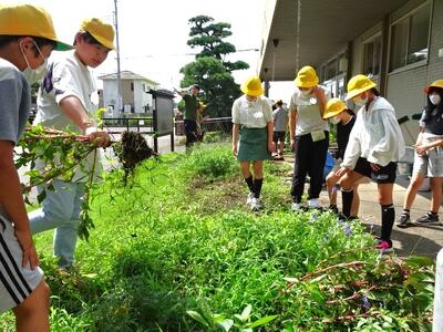 9日(月)の昼休みに「かみまつタイム(緑の時間)」を実施しました。今年は例年よりも暑いのか、花壇の花々もかなり枯れてしまい、たくさんの雑草が蔓延っていました。校庭の石を拾ったり、広場の除草を行ったりと、環境委員会の子どもたちを中心に緑化活動に集中して取り組みました。