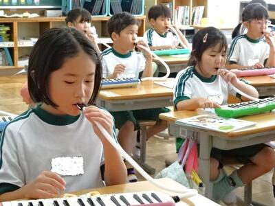 【2年生】2階から鍵盤ハーモニカの音が聞こえていきます。教室に入ると、みんなで「かえるのうた」を演奏していました。「めざせ楽器名人」という単元の学習です。鍵盤ハーモニカの名人がたくさん誕生しました。