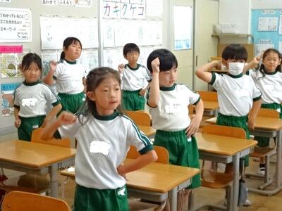 【3年生】10月の運動会に向けて、少しずつ動き出しました。1枚目の写真は、プロジェクターに映し出された映像を見ながら、ダンスの動きを覚えている様子です。