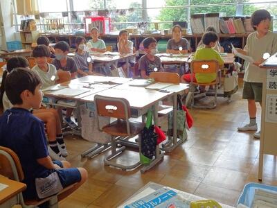 【6年生】1枚目の写真は、外国語の学習の様子です。今日は、夏休みの思い出を英語で発表する日です。3カ所に分かれて、夏休みの出来事を報告し合いました。