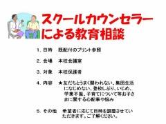 すでに通知をさせていただいていますが、本校に今年配置となった「スクールカウンセラー(今年度限定)」の教育相談の希望を現在とっています。豊富な知識と事例をもっていらっしゃる専門家の方との教育相談を希望の方、ぜひお申し込みください。限られた日時ですので意に添えない場合もございますのでご了解ください。(下の通知参照:既配付)