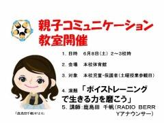 2つ目ですが、今週に迫りましたが土曜授業参観が実施されます。(本校の土曜授業日です)案内のとおり、親子でコミュニケーション力の向上を図ろうというのが目的です。1時間目の授業参観と併せてご参加ください。お待ちしております。
