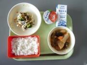 献立名:ごはん ♡牛乳 鶏肉と野菜のごまに ひじきサラダ ♡県産イチゴヨーグルト