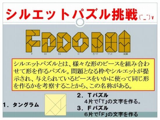 さて、今日はスクールエキスパート事業の4回目となります。5年生が松本隆雄先生に「シルエットゲーム」(算数パズル)を指導いただきました。パズルは松本先生手作りのものです。ハノイの塔、竹トンボなど多才ですね。このシルエットゲームは実に難解ですが、脳の活性化には最適のように感じました。また忍耐も必要ですし、粘り強さも肝要です。校長室前に「シルエットゲーム」一式をいただいたので自由に挑戦してもらおうと思います。2・3年生も松本先生の授業があります。楽しみしていてください!(^^)!