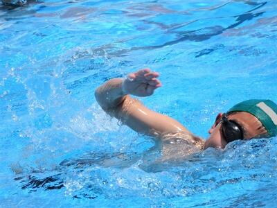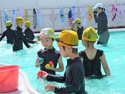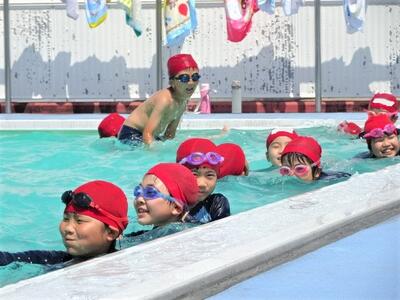【3年生】晴天の下、水泳の学習が行われています。今年は、梅雨が早くあけたおかげで、プールにしっかりと入ることができ、水泳の学習も充実したものになっています。3年生も、大プールにすっかり慣れて、気持ちよさそうに活動していました。