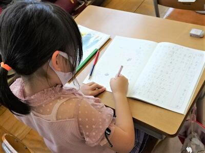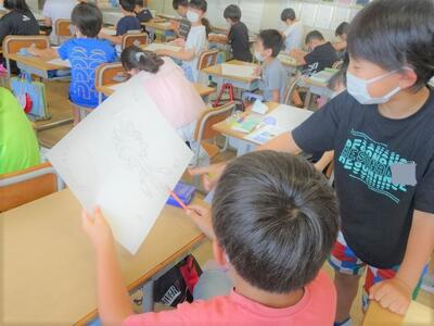 【4年生】1枚目の写真は、図工の時間に新しい単元「まぼろしの花」の下絵を描いている様子です。「まぼろしの花」というイメージから、自分なりの想像を広げていきます。声を掛けると「フェニックスをイメージしてみました」と、とてもかっこいい花の下書きを見せてくれました。