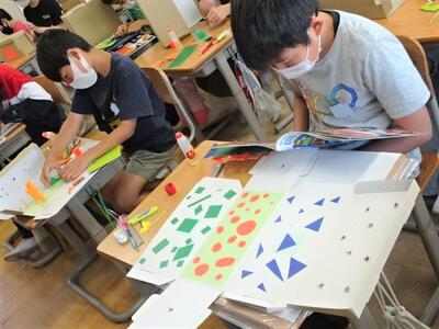 【2年生】2年生も新体力テストの測定に挑戦していました。シャトルランは、5年生が数えるのを手伝ってくれました。図工の「わっかでへんしん」では、上手な飾りをつけていてファッションショーのようでした。