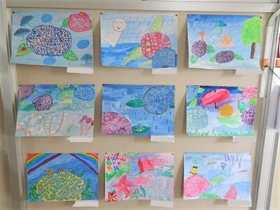 今日は、3年生の図画工作科の時間に作成していた「私の6月の絵」です。「6月」をイメージしたことを、それぞれが絵に書き表していました。「あじさい」や「かたつむり」「雨」など、子どもたちにも6月は梅雨の時期というイメージが定着していることが分かります。