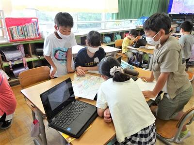 【6年生】1枚目の写真は、修学旅行の振り返りを行っている様子です。「総合的な学習の時間」の中の活動の一つで、修学旅行で実際に体験や見学をしてきたことをまとめていくのです。今しっかりと振り返り、やがて発表資料にまとめていきます。