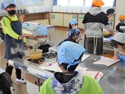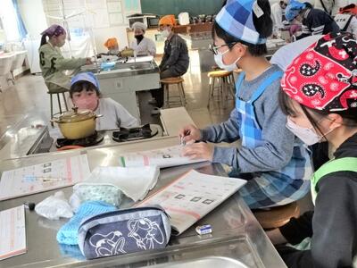 昨年の12月の、5年生の家庭科調理実習の様子です。「食べて元気!ご飯とみそ汁」という単元の学習でした。みそ汁は11月中に行っており、今回はご飯を炊く実習です。透明の容器での実習なので、ご飯がどのように炊かれていくかを観察することができました。