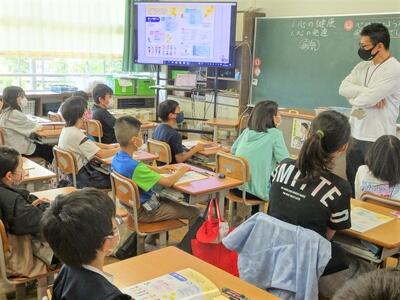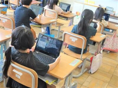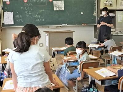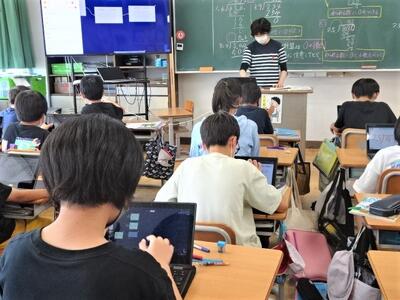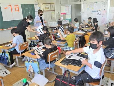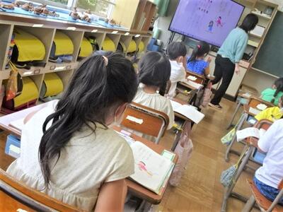 【1年生】1枚目の写真は、算数の時間にクロムブックを活用している場面です。ロイロノートを使って、たしざんの式を書き込みました。みんなの回答を大型提示装置で確認しながら、楽しくたしざんの問題を解いていました。2枚目の写真は音楽の時間です。みんなノリノリです。
