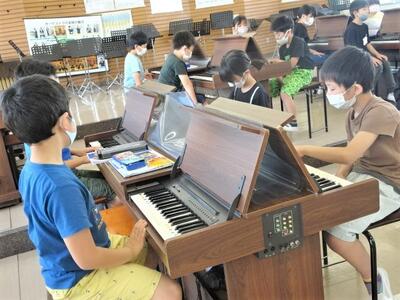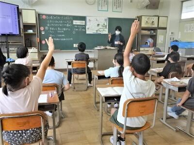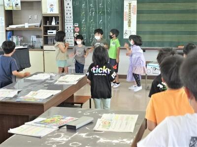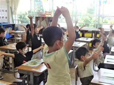【2年生】1枚目の写真は、音楽の時間の写真です。一つ一つの音符に合わせた動きを決めて、いくつかのリズムパターンを作りました。前にでた代表の児童がリズムの手本を見せると、みんながそれに合わせて同じ動きをして楽しんでいました。