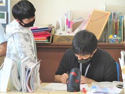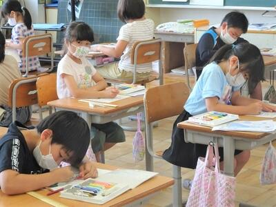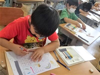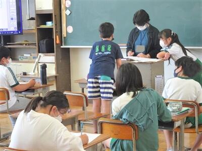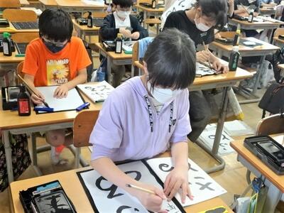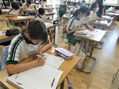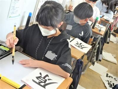 【3年生】3年生の書写も、だんだんと難しい字に挑戦していきます。1枚目の写真は、外部講師の先生に教わりながら、「日」にチャレンジしている様子です。「横画」「縦画」に続き、「おれ」を学習しています。筆の使い方が少しずつ上手になってきています。