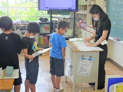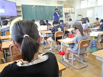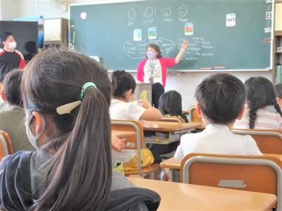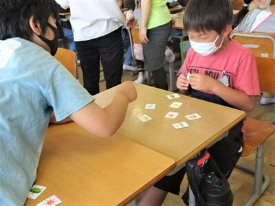 【4年生】4年生の外国語活動も軌道に乗ってきました。1・2枚目の写真です。今日は、曜日の学習をしていました。曜日の確認をした後、小さなカードを使って二人組でゲームを行いました。楽しく英語に慣れ親しんでいます。