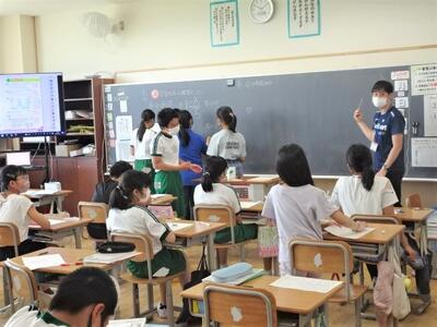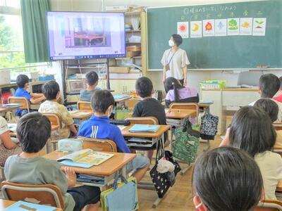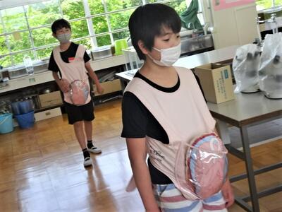 【5年生】1枚目の写真は、理科の時間の一場面です。「ヒトのたんじょう」という単元に入り、胎児の重さなどを体験する活動をしています。エプロンの袋の中に入っているのが胎児です。羊水等を入れて約Kgの重さがあります。「こんなに重いんだ」と感想をもらしていました。