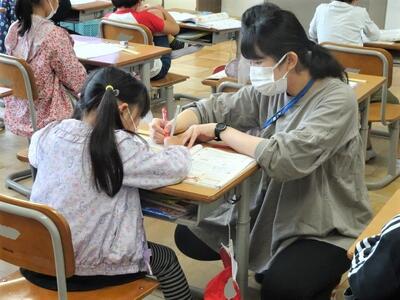 【1年生】1枚目の写真は、単元テストに挑戦している様子です。1年生も、単元テストにも慣れてきた感じがします。自分の力で問題を読み、しっかりと回答をしているのが分かりますね。