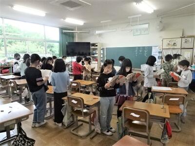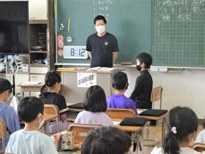 【せすじピン!と立腰!タイム】保健委員会による朝の活動前の取り組みです。朝の活動の最初の1分間を使って、背筋をピンと伸ばした姿勢を奨励する活動を行っています。保健委員の5・6年生が各教室に行って手本を示してくれるので、下級生もそれにならって姿勢をピンとしています。