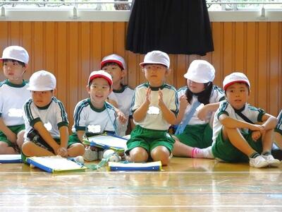 【1年生】1枚目の写真は、新体力テストのシャトルランをしている友だちを応援している様子です。今回も5年生が手伝ってくれて、あたたかい応援の中の運動になりました。