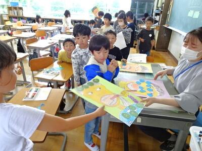【2年生】1枚目の写真は、虫歯予防に関するポスター作りの様子です。昨日背景に着色して完成させた絵に、今日は一人一人が考えた歯磨きに関する言葉を貼りました。