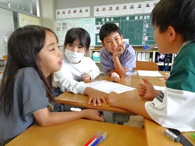 【3年生】1枚目の写真は、総合的な学習の時間の一コマです。上松山小学校のことを調べていますが、今度、昔のPTA会長さんに来ていただく機会があります。どんなことを質問するか話し合っています。