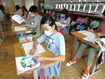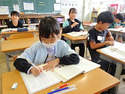 【6年生】1枚目の写真は、国語の時間の様子です。新出漢字の学習をしていますね。一つの単元でかなりの数の新出漢字がでてきます。書く練習は今も有効な学習法です。