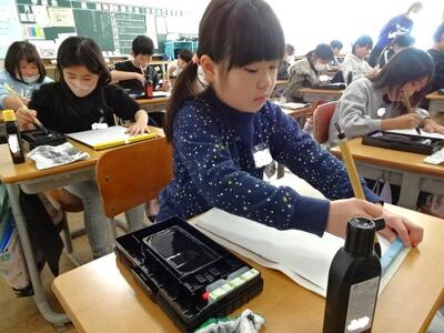 【3年生】3年生の書写の時間には、年間10回程度、専門の指導者に来ていただいています。今日は、今年度の最後の学習になります。道具の準備から片付けまで、習字の基本をたくさん教わりました。