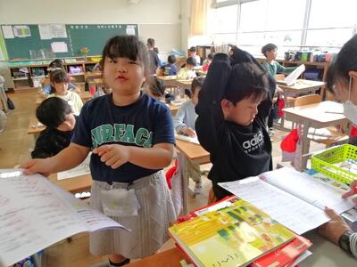 【5年生】1枚目の写真は、理科の「花のつくり」の学習の様子です。今日は、アブラナの花の作りについて、花を分解しながら調べていました。花びらやおしべ・めしべ等、形や数に着目して調べることができました。