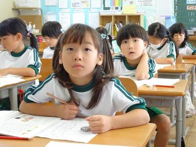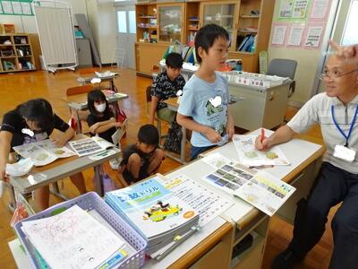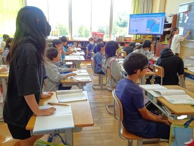 【2年生】1枚目の写真は、国語の「書いたら、見直そう」の学習の様子です。この学習では、普段の様子を書いた文章を見直す学習です。まずは、教科書の文章例から、見直すところを考えていきます。