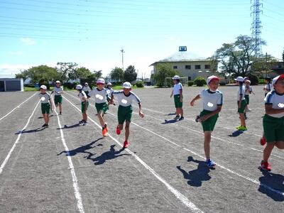 【5年生】1枚目の写真は、体育の「短距離走・リレー」の学習の様子です。どうすれば最高のバトンパスができるのか練習を積み重ねています。写真は、タイムアタックをしている様子です。