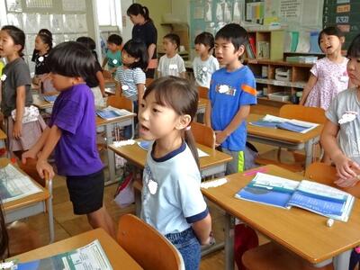 【4年生】1枚目の写真は、総合的な学習の時間の一コマです。4年生は福祉の学習をしています。今日から「認知症サポーター講座」をクラスごとに受講します。