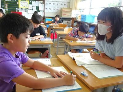 【2年生】1枚目の写真は、国語の「ことばでみちあんない」の学習の様子です。地図を見ながら、正確に伝えるにはどうしたらよいか話し合いました。