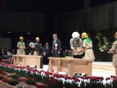 次に、大会宣言が読み上げられ、次の開催県である石川県知事に「木製の地球儀」がリレーされました。