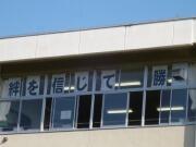 毎年、運動会ではスローガンやキャッチフレーズ、学校によってはマスコットなどが作られますが、本校では例年スローガンを児童会で作っています。今年のスローガンは「絆を信じて 勝っても負けても 一生けんめい たたかおう」です。児童から募集をして応募されたものを,つなぎ合わせて作った力作です。校舎の3階に期間限定で掲示されています。