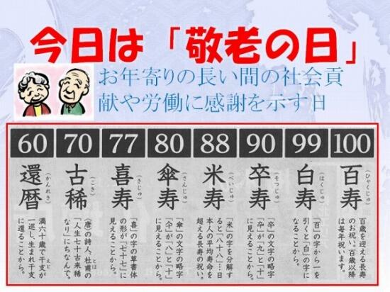 さて今日は敬老の日です。この日の意義は上記のとおりですが、日本全国で100歳以上の方が5万人超えたそうです。。超高齢化社会となりました。また行政上は65歳以上が高齢者といいますが国民の4人に1人ぐらいになります。65歳を超えてもまだまだお若いということです。今日はおじいちゃん、おばあちゃんがおられる家庭ではそれぞれの「敬老の日」をお過ごしください!(^^)!