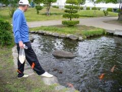 昼休みに、百年堀のコイにえさをあげました。吉田先生が、池の縁の石を足でたたくと、一斉に集まってきました。職員室の先生方のおすそわけのパンを与えると、「チュッパ!」と音をたててパンを一飲み・・・。コイにも性格があるらしく(吉田先生の話)、勢いのあるコイ、控えめなコイ・・・。みんなで大切に育てていきたいですね。