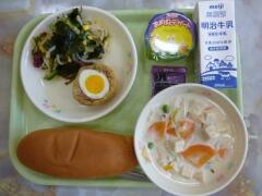さて、無担任の先生方は基本、職員室内の給食となっていますが、今日は出張等の関係で3名です。(通常は8名程度)ちょっとひっそりした給食になっています。今日のお薦めはクリーム煮でしょうか。うずらの卵と鶏肉がしっかり入り、主食といってもよいくらいボリューム、そして味でとても満足でした。肉団子に野菜入り初めての食感です。献立表の材料が大変多いのも今日のメニューの特徴です。