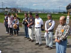 稲刈りボランテイアの皆さん 説明をしっかり聞いて
