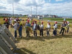 米づくりプロジェクトも最終段階を迎えました。今日は13時50分から稲刈りを行いました。ボランテイアの皆さんのご協力をいただき挑戦です。稲刈り班と稲運び班に分かれて、交代で行いました。初めはエンジンのかからなかった子どもたちも途中から全開、ボランテイアの皆さんも驚く早さで終了となりました。最後はコンバインから米が出てくるところを見学させてもらって稲刈り体験は終了しました。落ち穂拾いをしたり、裁断した稲わらを田んぼにまんべんなく敷いたり、後片付けもばっちりです。