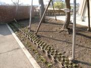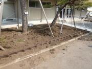 体育館前に、アカマツとクロマツの2本の松があります。体育館から流れる雨水の関係で土壌が流れてしまうことがたびたびありました。そこで写真のとおり模様替えをしました。外部発注でなく校内工事です。「りゅうのひげ」を植えました。リュウノヒゲは、日陰でもよく育ち、強健で育てやすいので古くから庭の樹木の下などに植える下草として利用されてきました。現在でも需要は高く、花壇の縁取りやグラウンドカバーにも用いられます。学校にお越しの際はぜひご覧ください(@_@)