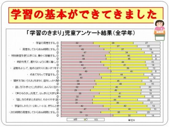 先日、「学習のきまり」について子どもたちにアンケート調査を実施しました。これは1・2学期に実施してその結果を比べて分析をしていき、今後の学習指導に生かしていこうというものです。学習の準備、姿勢(「ピン ピタ グー パー」の徹底)、学習の仕方などに伸びが見られました。まだ、改善すべきこともありますがデータから全体像をとらえ、個々の分析をとおして次年度の策を講じていきたいと思います。クリックするとアンケート結果と1・2学期の比較などが見られます(@_@)