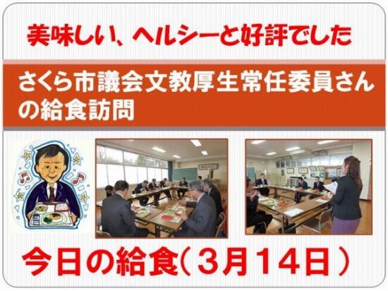 今日は、計画されたさくら市議会文教厚生常任委員さんの給食訪問がありました。今日のメニューは献立どおりで、初めて食べられる方もいましたが大変好評でした。献立のこと、カロリーのこと、アレルギー対応、子どもたちの喫食状況、残量などご質問をいただきました。お世話になりました。今日は地産地消メニューでしたので,さくら市産の食材も多く大変興味深く食されていました。
