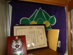 正面玄関を入ってところに賞状・楯・トロフィーのケース・棚があります。左側のケースは「昭和63年度卒業生一同」と書かれているので卒業記念でいただいたものと思います。その一角に写真のような表示板を取り付けました。このコーナーには現在、塩谷地区・栃木県で表彰された緑化コンクールの受賞グッズが入っています。この後、来年度に表彰された全国表彰関係品を納めて後世に伝えていきたいと思います。表示板はいつものとおり校内オリジナルで出来栄えは最高です(^^)
