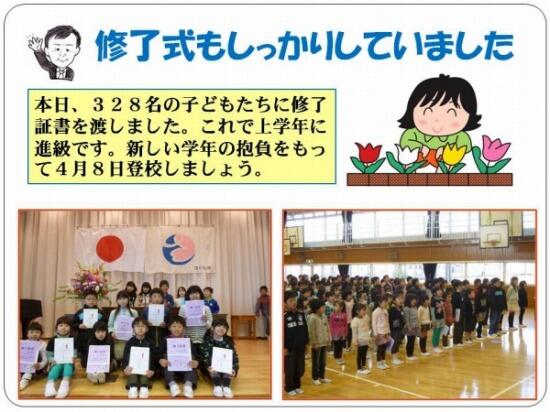 さて、修了式ですが毎回の式で思いますが、全員しっかりした態度で式に臨むことができました。まったくすばらしいです。本校のよき伝統であると思います。みどりの学校日本一、式に臨む態度日本一・・・いっぱい日本一を目指していきましょう。本日328名の児童に修了証書、進級祝賞を渡しました。あゆみを親子で見ていただき、今年1年間のこと、進級学年のめあてなどを春休みに話し合う機会をもっていただける幸いです。よろしくお願いします。